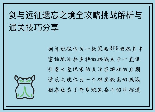 剑与远征遗忘之境全攻略挑战解析与通关技巧分享